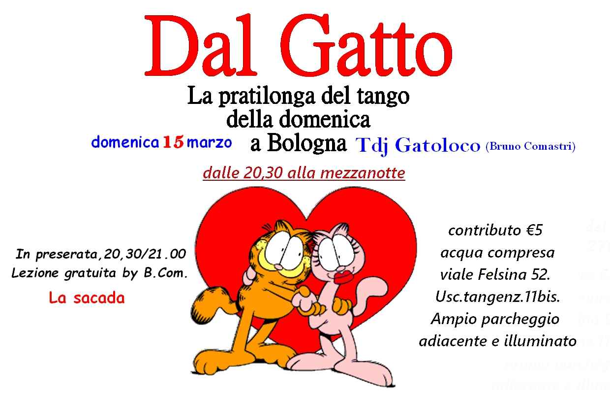 Dal Gatto - Pratilonga:20.30/21 lezione gratuita by B. Com, poi si balla il tango in tutte le sue versioni dalle 21,00 alla mezzanotte. tdj El Gatoloco (Resident) presso il circolo il Fossolo, affiliato Arci/uisp,