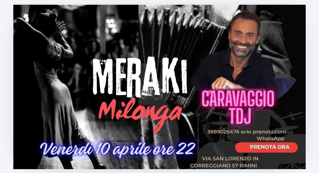 💃 Meraki Milonga: Venerdì 10 Aprile ore 22 🕺 poche chiacchiere e tanto Tango. Torna l'appuntamento a Rimini con la selezione musicale eccelsa di Caravaggio Danilo TDJ. 🎧 Cosa trovi in serata: