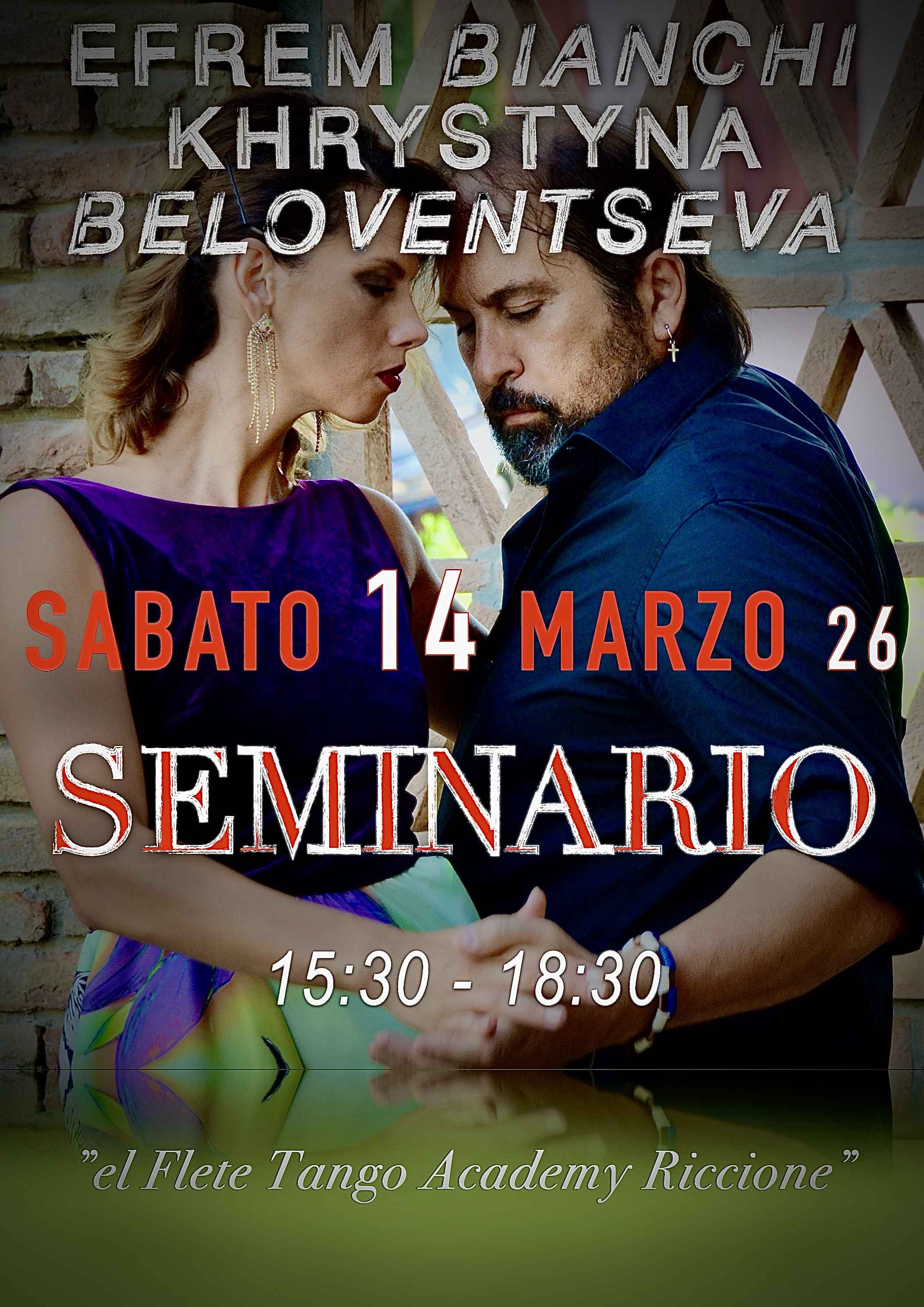I maestri Efrem Bianchi y Khrystyna Beloventseva propongono il loro Seminario intensivo: percorso dedicato alla interpretazione, musicalità e improvvisazione marca e struttura. Presso la "el Flete Tango Academy Riccione" un pomeriggio di studio e approfondimenti. Analizzeremo gli elementi, le tecniche e le dinamiche fondamentali per imparare e migliorare il proprio stile di ballo realizzando sequenze e dinamiche complesse. L'academy dispone di 3 sale dedicate con pavimento tecnico e ammortizzato. Lezioni individuali, tecnica femminile (domenica mattina 10:30-12:00), Stage. Info 333.5802524-331.4071781- costo dell'evento € 15 per partecipante (max 6/8 coppie di studio in sessione per ballerini con buona conoscenza del Tango).