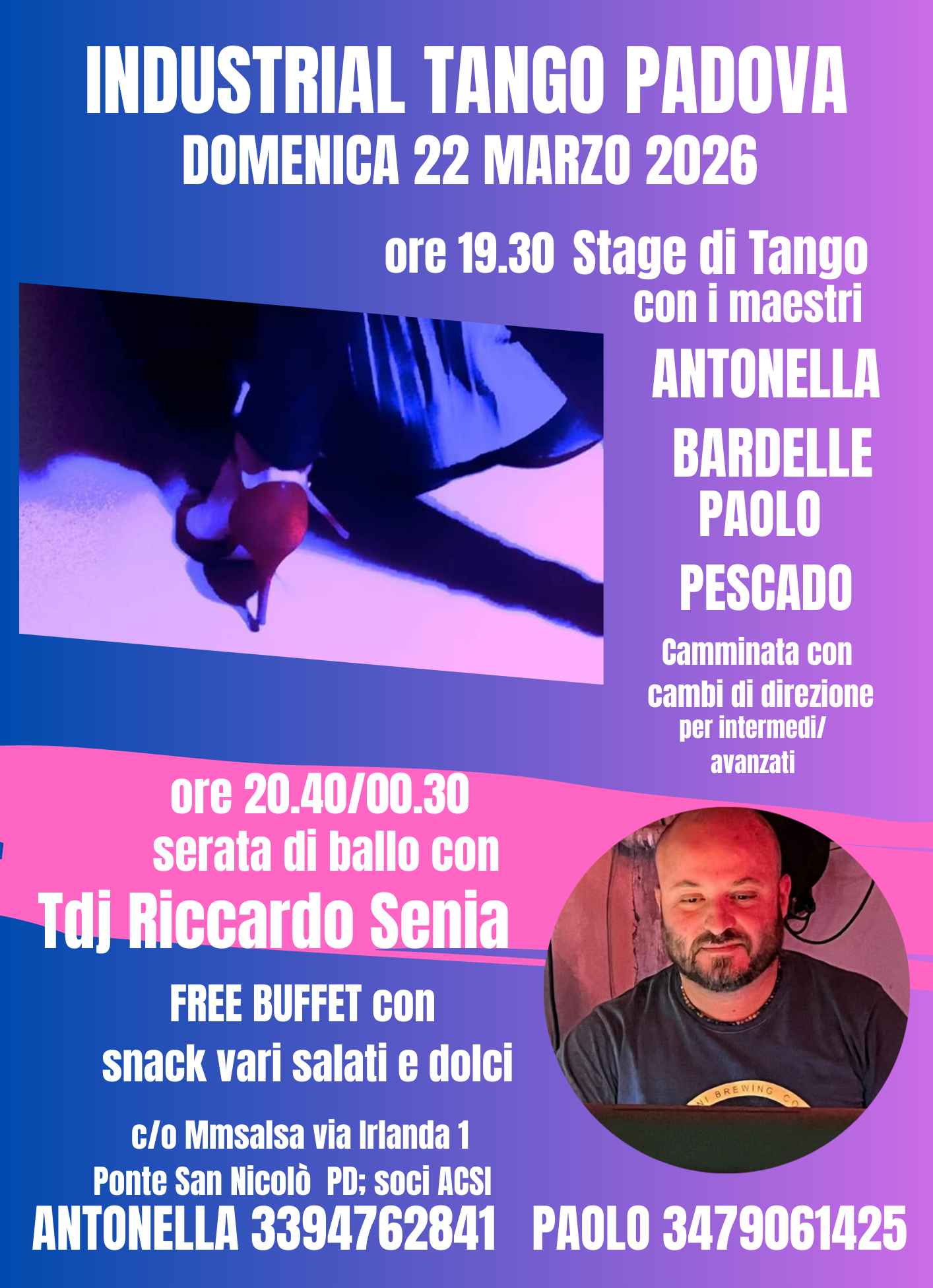 Domenica 22 marzo 2026in preserata alle ore 19.30/20.40stage di Tango con i maestri Antonella Bardellepaolo Pescadotema: Camminata milonguera con cambi di direzionelivello intermedio/avanzato