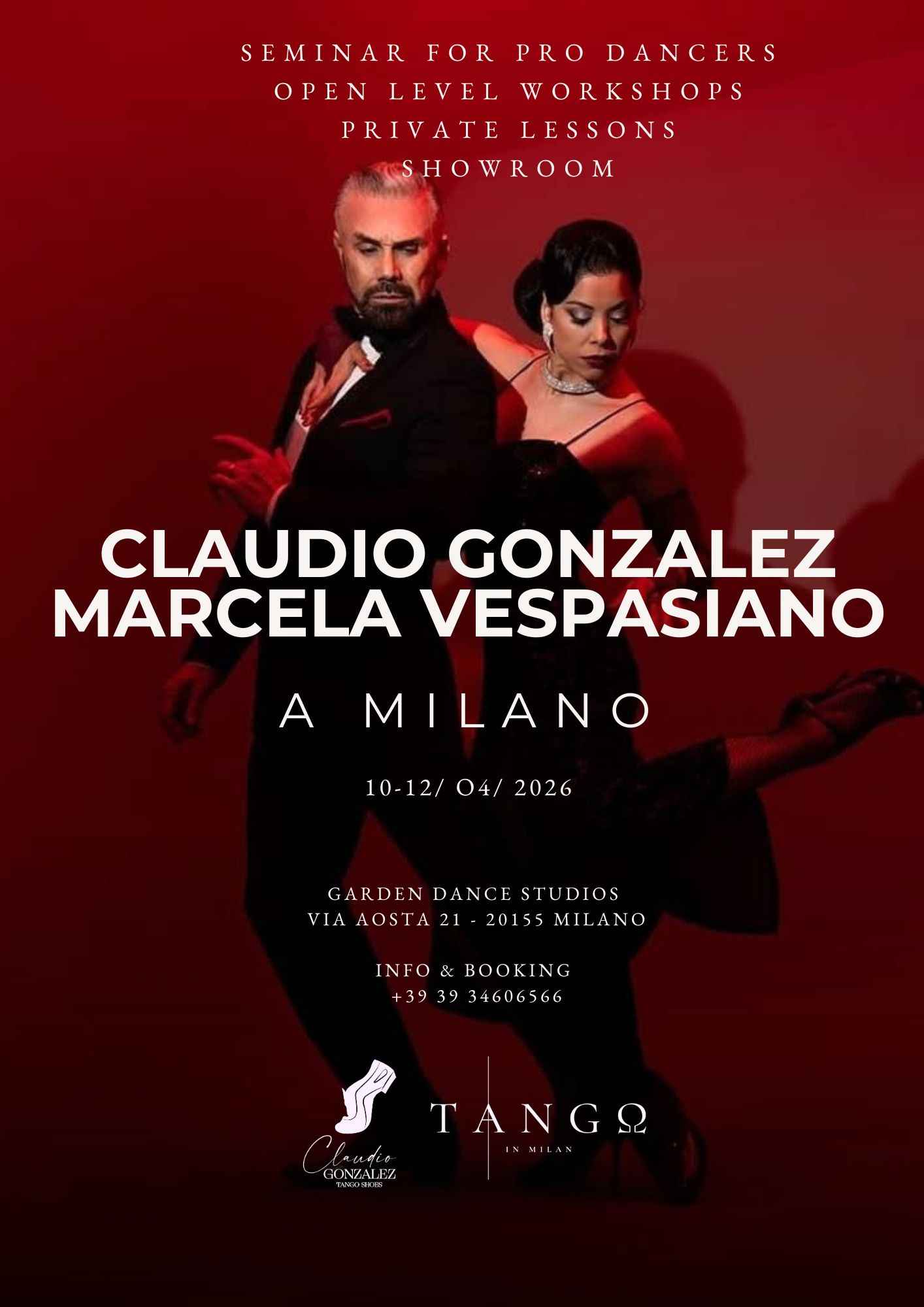 Dal 10 al 12 aprile 2026 avremo a Milano claudio Gonzalez e Marcela Vespasiano per una imperdibile full immersion in tango salón ed escenario, una occasione unica di formazione e crescita per amatori e professionisti che desiderano approfondire meccanica e struttura del proprio tango