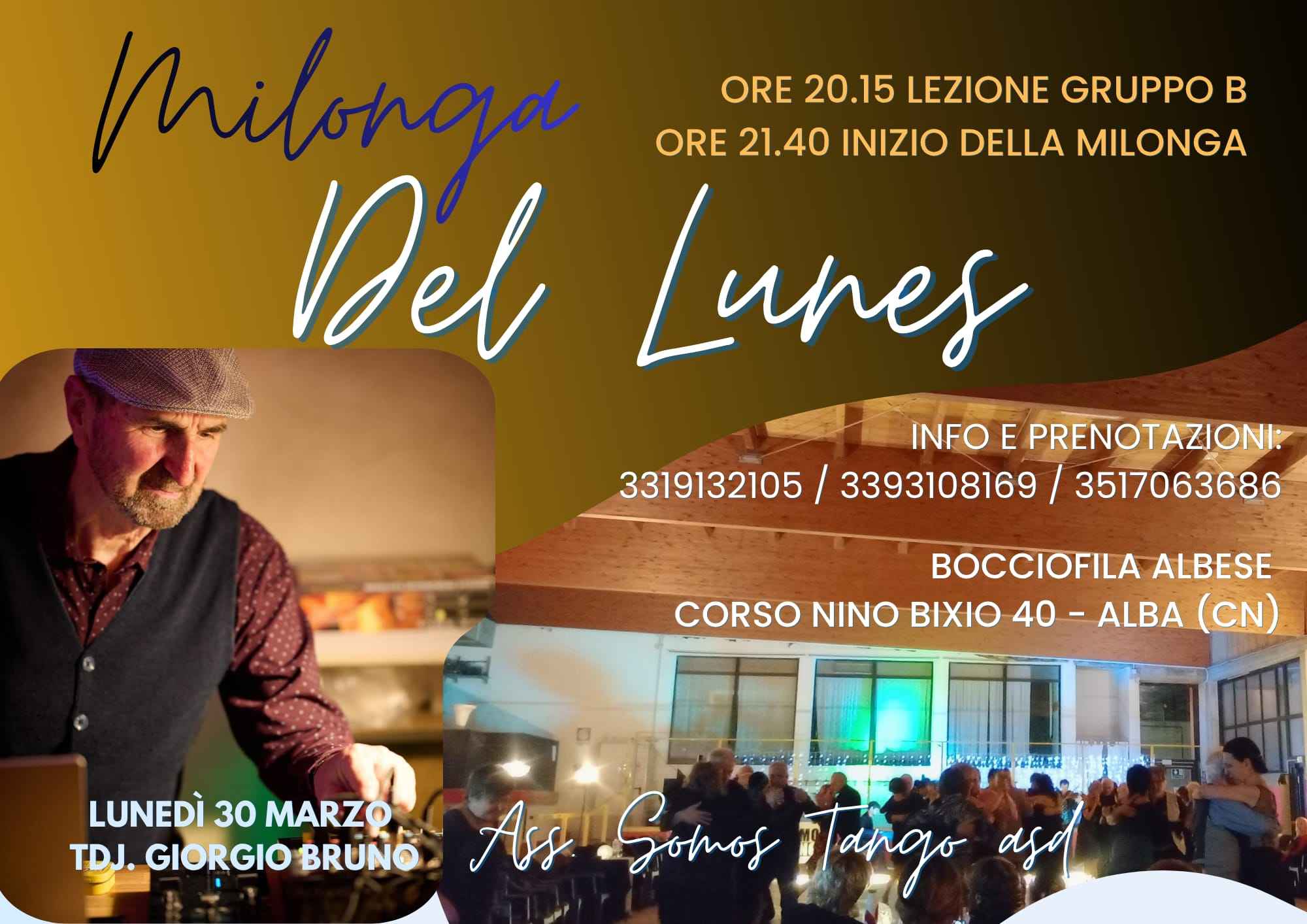 Lunedì 30 marzo 2026 🫂ore 20.15 Lezione Gruppo B                                                                                                                                                                                                             ➡️ore 21.40 Milonga Del Lunes.tdj ospite 🎧: Giorgio Bruno                                                                                                                                                                   🥂🍾 Ore 23.00 Dolci e bevande offerto dall'associazione