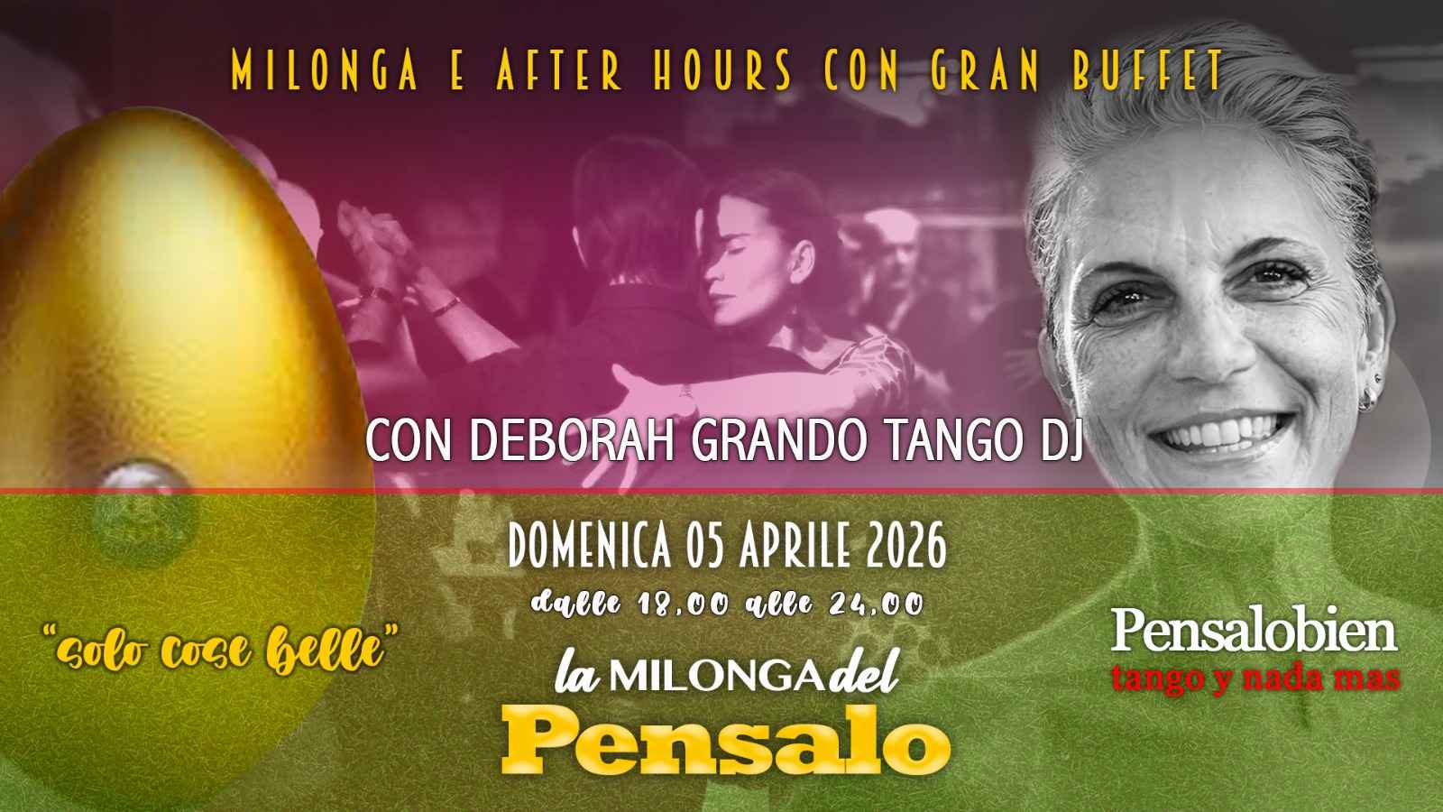 All’ora di cena vi aspetta un ricco buffet: energia extra per continuare a volteggiare sulla nostra pista in legno, amata e conosciuta da tutti i veri appassionati di Tango.la Milonga Pensalobien è un luogo aperto a tutti: potete venire per ballare senza sosta, o anche solo per sorseggiare un buon bicchiere di vino e scambiare due chiacchiere al fresco… sempre all’insegna del Tango di qualità! selezione Musicale: Tdj Deborah Grando