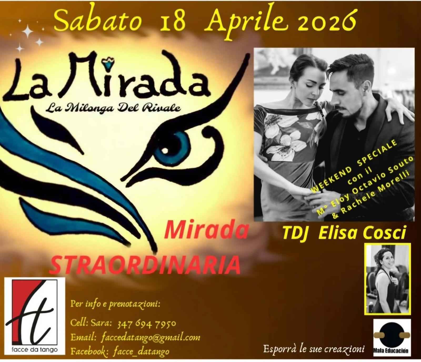 SABATO Sera, dalle 22,00 La Mirada -special Edition con la travolgente musica di Tj Elisa Cosci e un meraviglioso show dei Maestri Rachele y Eloy.contributo serata 12 €