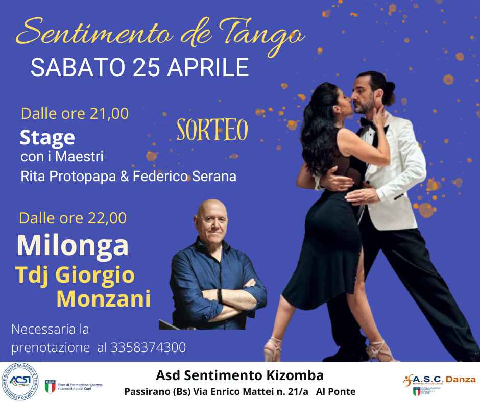 Brescia, Passirano Via Enrico Mattei n. 21/a. necessaria la prenotazione al 3358374300. Contributo € 10,00 compresa consumazione. durante la serata Sorteo. garantita la possibilità di sedere a tutti i posti prenotati. l'ingresso è riservato agli associati Acsi e Asc, possibilità di tesseramento in loco. durante la serata verranno offerti stuzzichini. siamo a pochi minuti dall’autostrada di Ospitaletto (Bs) ed uscita di brescia Ovest. comodo parcheggio gratuito. …. è inclusa l’accoglienza familiare che ci contraddistingue. In preserata, ore 21,00, stage con i maestri Rita Protopapa e Federico Serana