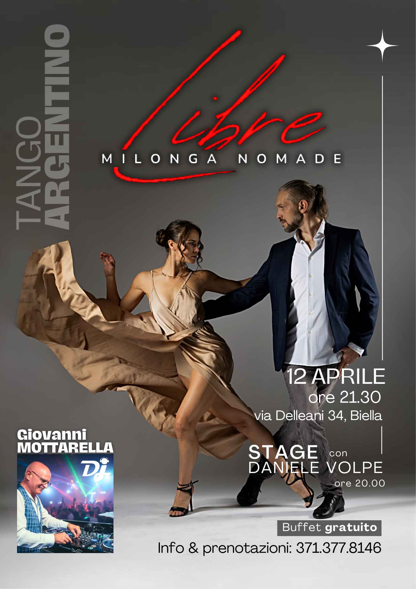 Una serata unica ti aspetta: “Libre – Milonga Nomade”, dove eleganza, passione e libertà si fondono in un’atmosfera intensa e coinvolgente.💃🕺 Sotto le luci soffuse, ogni passo racconta una storia, ogni abbraccio diventa connessione. Che tu sia esperto o semplicemente curioso, questa è la tua occasione per entrare nel mondo magico del tango argentino.🎧 In consolle DJ Giovanni Mottarella guiderà il viaggio musicale con selezioni irresistibili, mentre lo stage con Daniele Volpe (ore 20.00) ti permetterà di affinare stile e tecnica prima di immergerti nella milonga.🥂 E per rendere tutto ancora più speciale… buffet gratuito durante la serata!📍 Biella – via Delleani 34