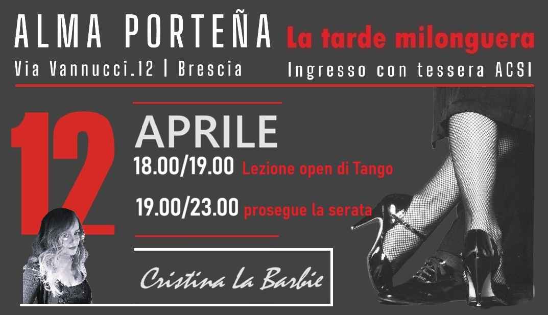 Alma Porteña La Tarde MilongueraDomenica 12 Aprile 18.00/19.00 Lezione aperta a tutti di Tango. Non è necessario essere in coppia.La serata prosegue dalle 19.00/23.00 ♪ selezione musicale a cura di Cristina La Barbie