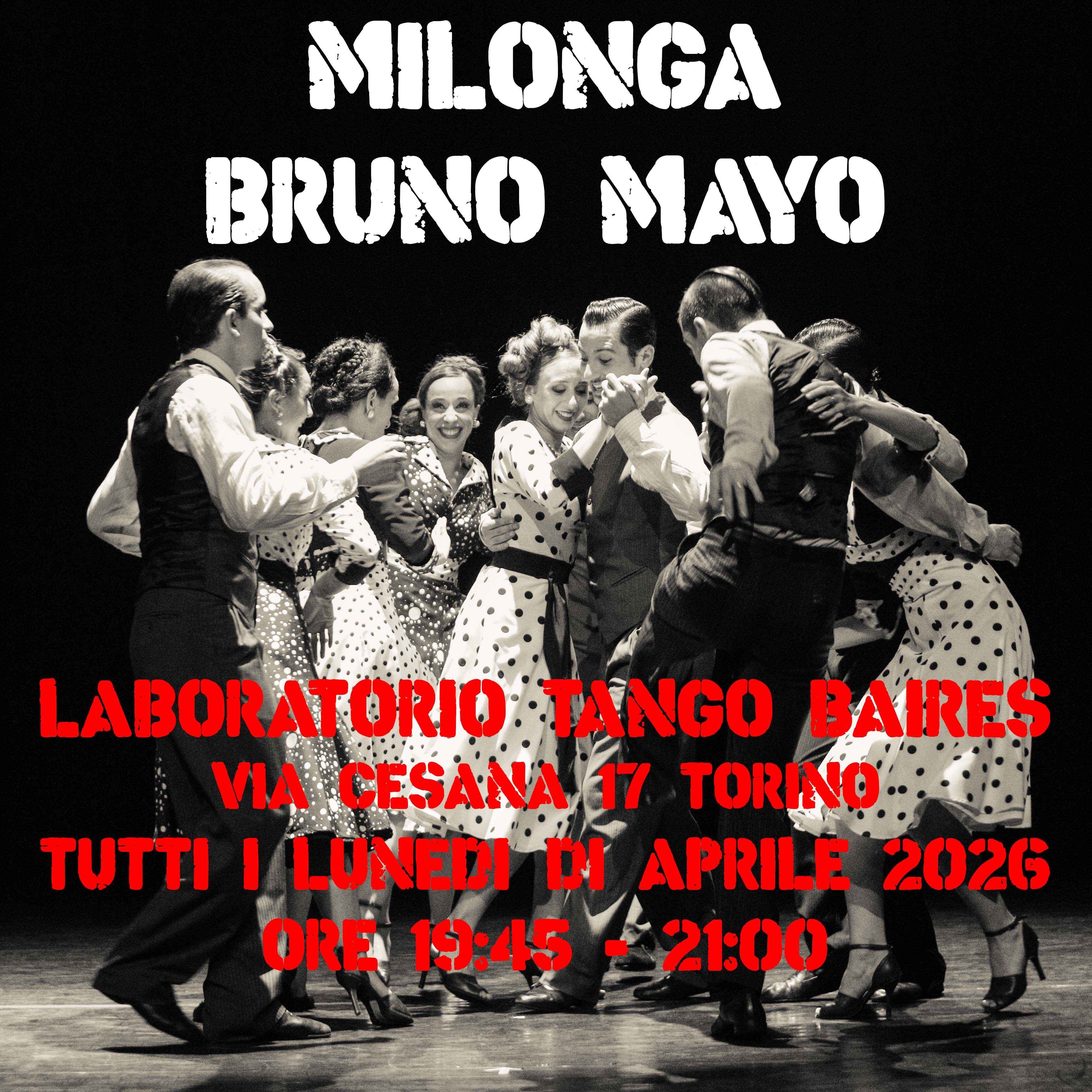 Il Laboratorio Tango Baires organizza per il mese di aprile 2026 tutti i lunedì una serie di incontri dedicati alla milonga con il Maestro Bruno Mayo, vincitore nella disciplina milonga nel primo Campionato Metropolitano della città di Buenos Aires.