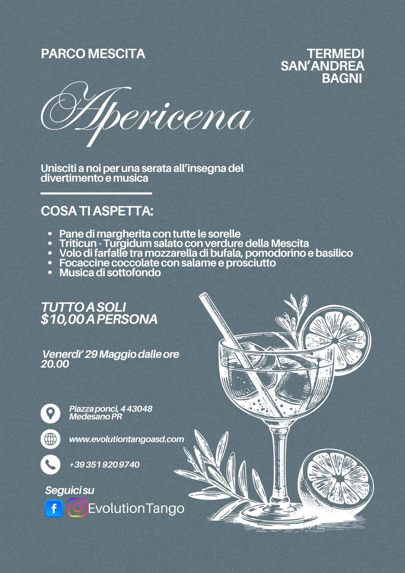 Venerdì 29 Maggio 2026 preparate le scarpe da ballo e il vostro cuore per una notte di passione e magia alla Milonga delle Terme! Nella splendida cornice delle Terme di Sant'andrea, vi invitiamo a immergervi in un'atmosfera d'altri tempi, dove il tango argentino si mescola alla bellezza del presente!