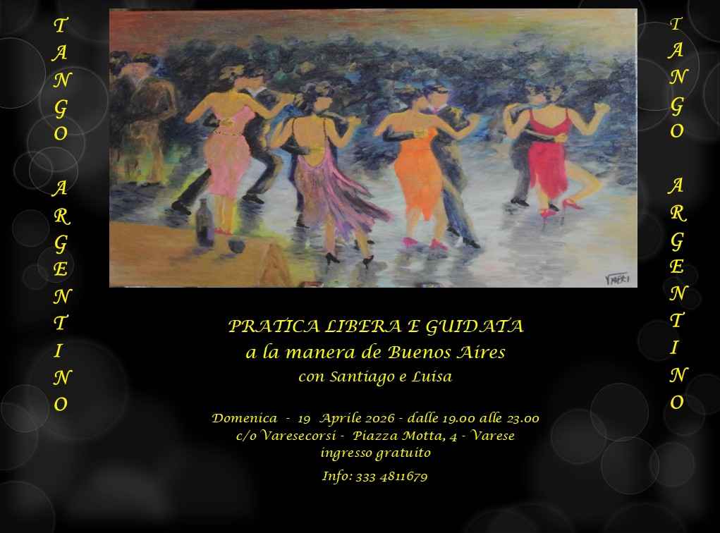 La Pratica Della Domenica A Varese Vi Aspettiamodomenica 19 Aprile 2025 - dalle 19 alle 23 pratica libera a la manera de Buenos Aires (ognuno se vuole, porta qualcosa da mangiare o bere) con Santiago e Luisac/o Varese Corsi "salone della Motta" in Piazza Motta 4 – Vareseingresso Alla Pratica Gratuitoin consolle per noitdj Piero Zillifashion; esposizione scarpe da tango uomo e donna“tangolera Shoes” Stages:dalle 16,00 alle 17,30 Tecnica Femminile E Maschile (adornos e sequenze ritmiche)dalle 17,30 alle 18,30 Vals (Liv. Intermedio/avanzato). Per questo stage solo iscrizioni in coppiaper prenotare le lezioni potete telefonare o mandare un whatsapp con il vostro nome e cognome.cell 333 4811679