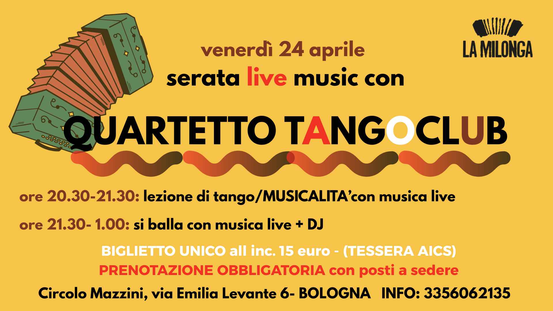 ore 21.30-01.00: serata di tango con Dj Patricio Lolli + musica live con il Quartetto TANGOCLUB