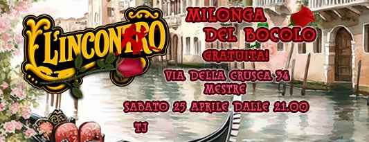 Per festeggiare S. Marco, la milonga del boccolo gratuita. Dove? All incontro, un luogo dove ritrovarsi per socializzare, ballare, abbracciarsi. Una vera casa del tango aperta a tutti coloro che desiderano avere una buena onda! iniziamo alle dalle ore 20.30 siamo in via della Crusca 34 Mestremusicalizadorevento soci Acsi con tessera valida. Possibilità di farla all'ingresso la milonga è gratuita, la prima consumazione 5 euro, le seguenti da listino.info E Prenotazioni Stefano 348 49 00 640. Clara 393 22 62 695vi aspettiamo per condividere con voi questa serata sempre specialecome Arrivare:da Venezia: autobus 24h , scendete fermata Pertini Chiesa ( 10 minuti di bus) , dopo la fioreria Primula Gialla girate a destra ( Via Della crusca) proseguite per 100 metri e seguite le indicazioni.in Macchina: Troverete parcheggio in via della crusca, vicino alla milonga. e c'è un parcheggio vicino alle fermate dell'autobus Pertini Chiesa.