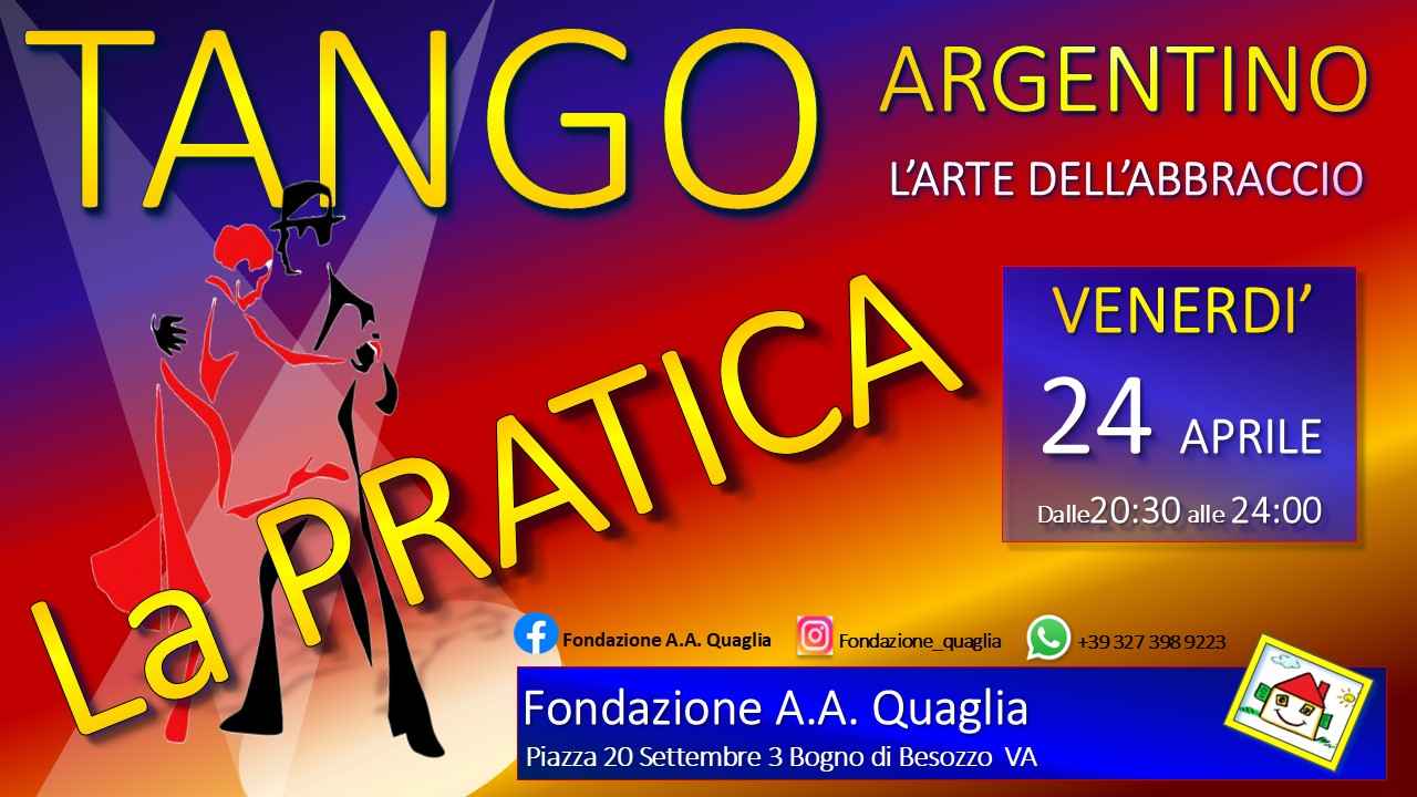 La Pratica    nuovo appuntamento per praticare l’arte dell’abbraccio presso la Fondazione A.a. Quaglia venerdì 24 Aprile dalle ore 20:30 fino le 24:00 piazza 20 settembre 3 a Bogno di Besozzo Va gradita la Prenotazione con Messaggio Whatsapp tel: 327 398 9223            vieni a vivere con noi una serata indimenticabilebuffè autogestito, come da tradizione ognuno porta qualcosa si può parcheggiare anche su via Monteggia  e presso il piazzale della chiesa di Bogno