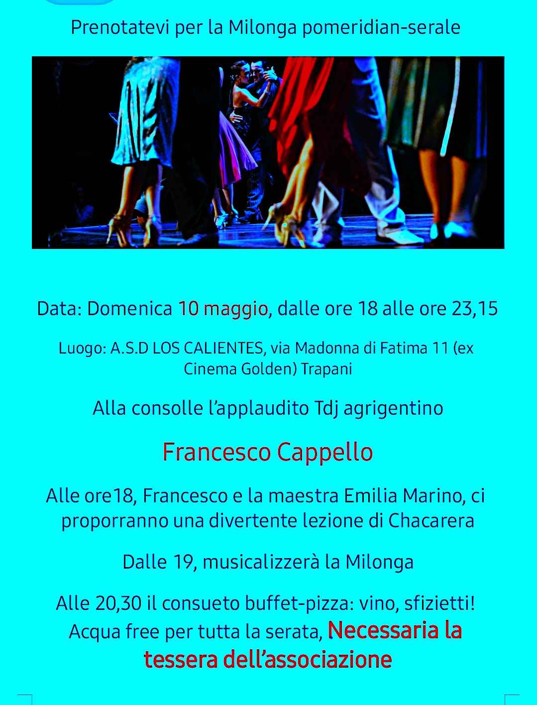 Proponiamo la formula pomeridiano/serale ed un'apertura di evento divertente e sempre differente: In questa serata, alle 18 per chi sarà puntuale, gli apprezzati maestri agrigentini, Francesco Cappello ed Emilia Marino, terranno una lezione di Chacarera, fruibile da tutti coloro che saranno presenti, dopodiché, dalle 19, sempre Francesco, nel ruolo di Tdj, ci proporrà la sua personale selezione di Tanghi, Vals e Milonghe. Verso le 20,30 verrà aperto il Buffet per ricaricare le energie.